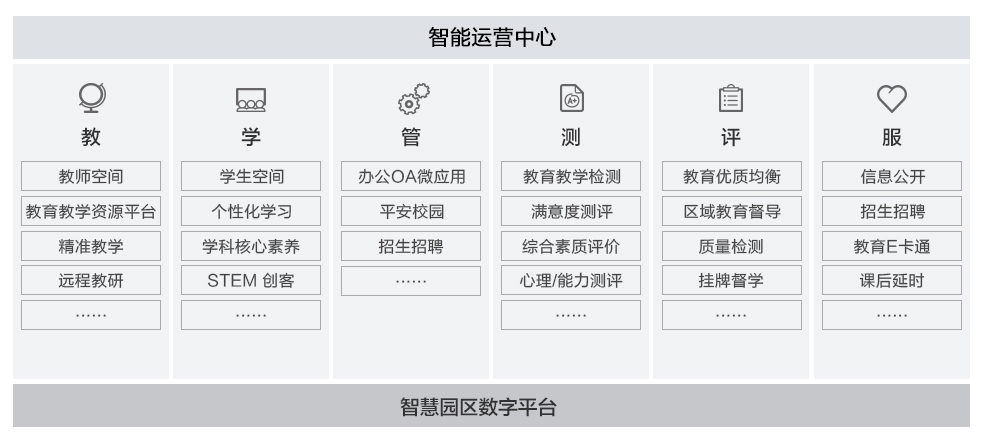 基礎教育是提高國民素質和造就人才的基礎工程,從作坊式教育和工廠式教育逐步走向個性化教育發展中國的教育發展已經發生了翻天覆地的變化。智能化校園解決方案以人為本,通過數字化技術實現從傳統教育向智慧教育轉變,從傳統校園向智慧校園轉變,圍繞教、學、管、測、評、服等六個方面,打造健康、安全、高效、創新的智慧校園;將各校園相關數據進行采集、匯聚、分析、服務,實現區域教育、教學優質資源的共享。
