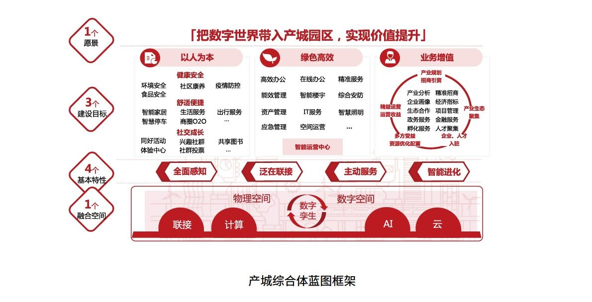 從"智生產"、"智生活"和"智交通"三個維度,列示未來智慧產城綜合體應具備的要素與特征,指導智慧園區(qū)規(guī)劃與建設,打造業(yè)務多樣化、設施智能化、管理數據化和服務主動化的產城綜合體。