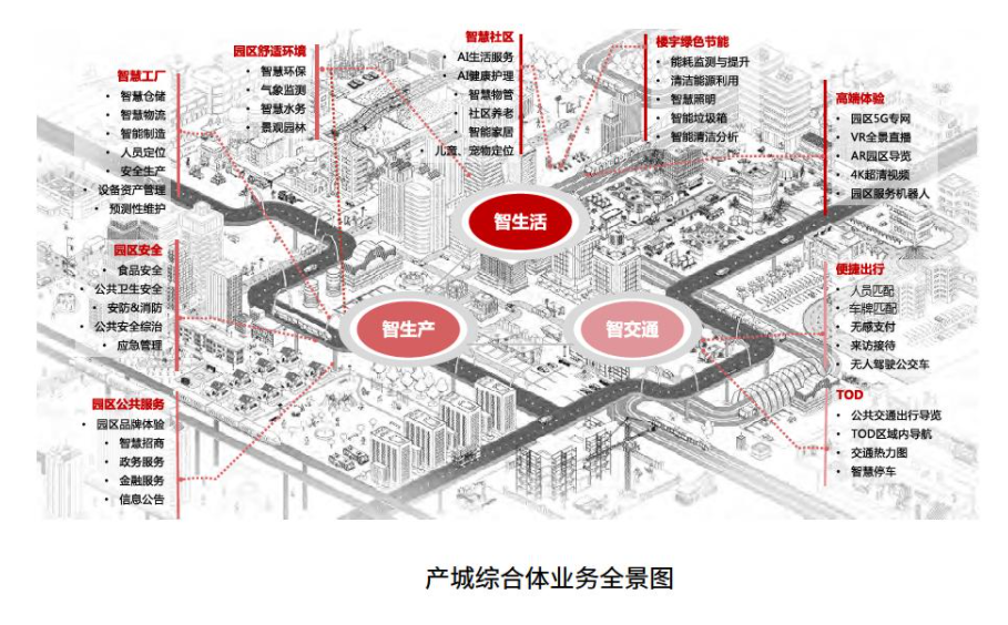 基于藍圖框架,圍繞產城綜合體中社區(qū)、工廠、樓宇、交通、環(huán)境、安全和公共服務等場景,可以全面勾勒出未來產城綜合體的全景圖(如圖所示)。