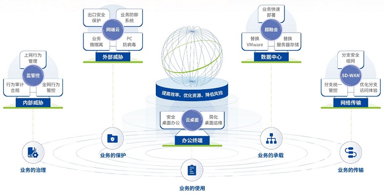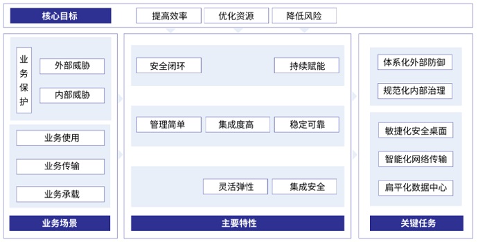 數(shù)字化轉(zhuǎn)型的核心目標是“提高效率、優(yōu)化資源、降低風險”,業(yè)務場景包含“業(yè)務保護、業(yè)務使用、業(yè)務傳輸、業(yè)務承載”,將核心目標與業(yè)務場景相結(jié)合,可明確數(shù)字化轉(zhuǎn)型關(guān)鍵任務為“體系化外部防御、規(guī)范化內(nèi)部治理、敏捷化安全桌面、智能化網(wǎng)絡(luò)傳輸、扁平化數(shù)據(jù)中心”。企業(yè)可進一步結(jié)合自身的發(fā)展情況,從最為緊迫的關(guān)鍵任務入手,一步步走好轉(zhuǎn)型之路。