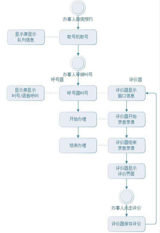 辦事完畢后,辦事人可通過智能評價器對本次辦事進行評價,評價分 1-5 級。另外服務窗口也可以通 過虛擬呼號器對本次辦事的辦事人添加標簽,如客氣、溫和、有耐性等等,方便下一次同樣的辦事人到其 他窗口辦事時服務窗口人員的應對。