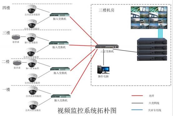 嚴格遵循綜合布線標準,采用六類線、光纖結合的方式; 所有前端網絡攝像機通過六類網線全部連 接到各所屬區域的接入層交換機,再通過光纖或網絡線連接到監控中心的核心交換機。