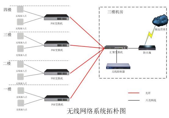 無線網絡采用無線接入點(AP) +無線控制器(AC) 的企業級無線網絡系統架構,星型拓撲結構。在