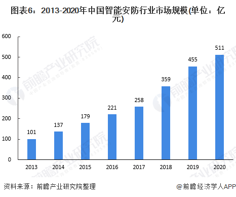 根據(jù)中安網(wǎng)《2020年中國安防行業(yè)調(diào)查報告》,2020年我國安防行業(yè)總產(chǎn)值為8510億元(其中安防產(chǎn)品總產(chǎn)值約為2600億元),根據(jù)2020年我國智能安防滲透率為6%測算,2020年我國智能安防市場規(guī)模約為511億元,2013-2020年市場規(guī)模年復(fù)合增長率達(dá)26%。