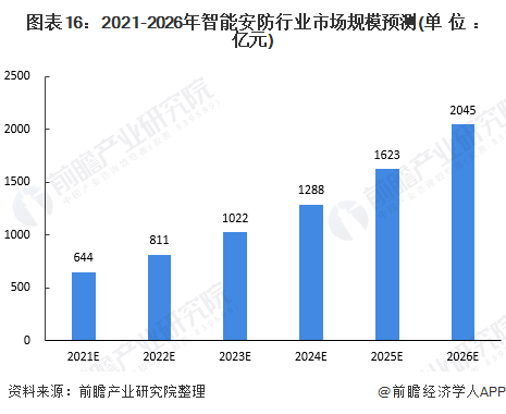 經(jīng)過多年的高速發(fā)展,安防已經(jīng)發(fā)展成為一個龐大的產(chǎn)業(yè)。在經(jīng)歷了數(shù)字化、網(wǎng)絡(luò)化發(fā)展后,安防行業(yè)未來將向智能化深度發(fā)展,智能安防市場規(guī)模也將持續(xù)增長,2013-2020年,我國智能安防市場規(guī)模的年復(fù)合增長率達(dá)26%,據(jù)此增長率,預(yù)計至2026年,市場規(guī)模有望達(dá)2045億元。