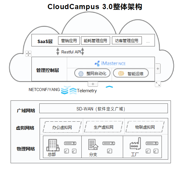 數字化正在從企業辦公延伸到生產、銷售、服務各個方面,無線終端數量爆發式增長,萬千應用加速從本地 向云端遷移,網絡也正從本地局域互通向多分支多云互聯的全球一張網架構演進。然而,傳統網絡以連接本地應用及有線終端為主, 在數字化時代難以為繼。我們需要全新的網絡架構才能夠?撐千變萬化的數字化業務。華為云園區網絡解決方案3.0 (CloudCampus 3.0) , 應用IoT、Wi-Fi 6、 SDN、 SD-WAN、云管理和AI等 技術,幫助企業構建一張全無線接入,全球一張網,全云化管理和全智能運維的園區網絡。從而,企業將受益于 極速的無線業務體驗,隨時隨地的自由協作和溝通,敏捷的云應用上線,以及可靠的應用體驗保障,讓大企業、政府、高校、普教、 醫療、零售、交通等各行業, 在云時代抓住數字化轉型新機會。